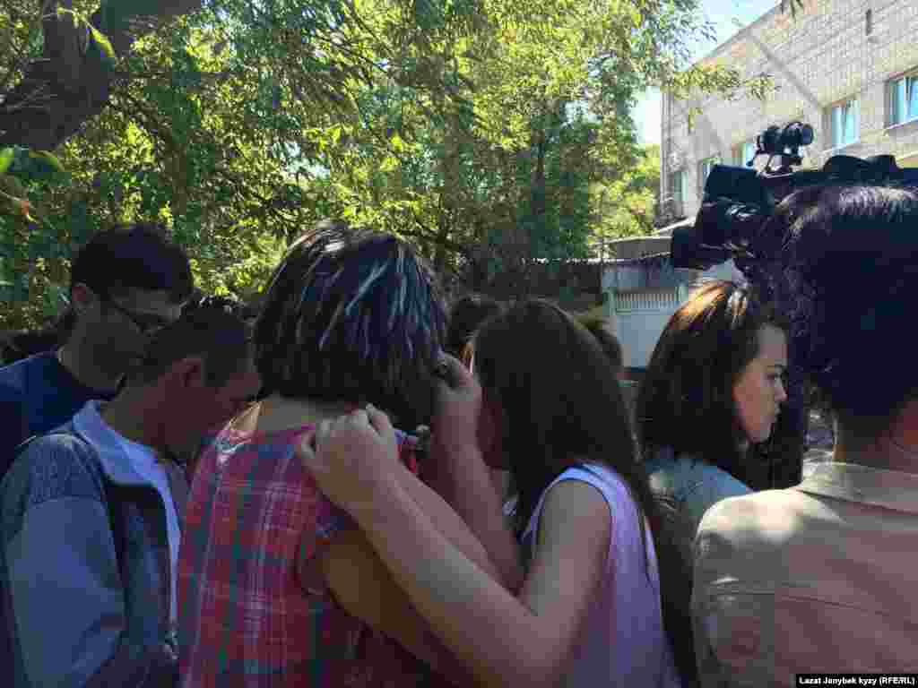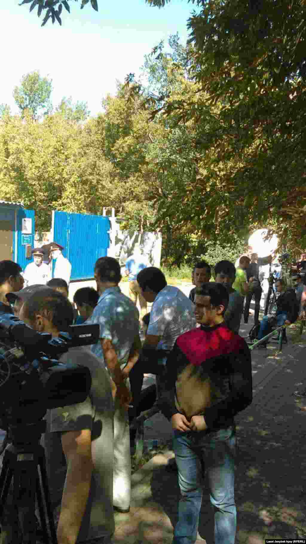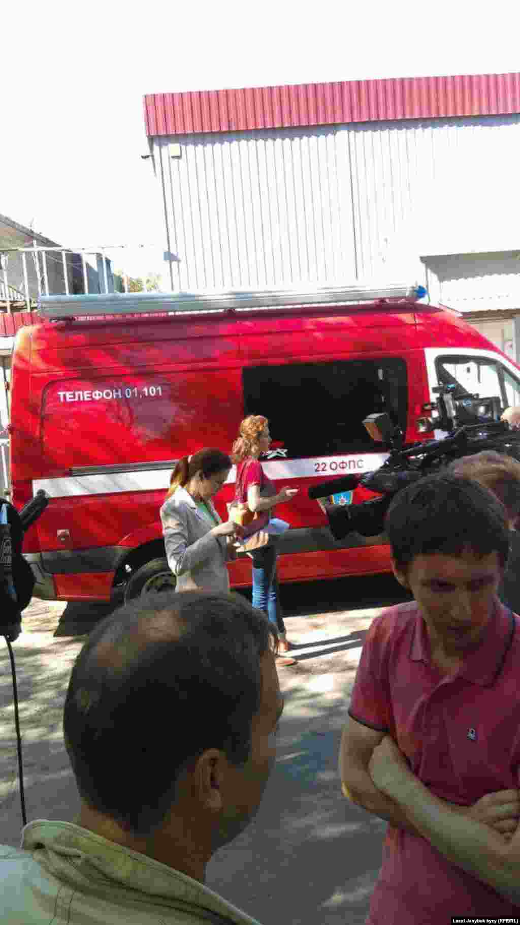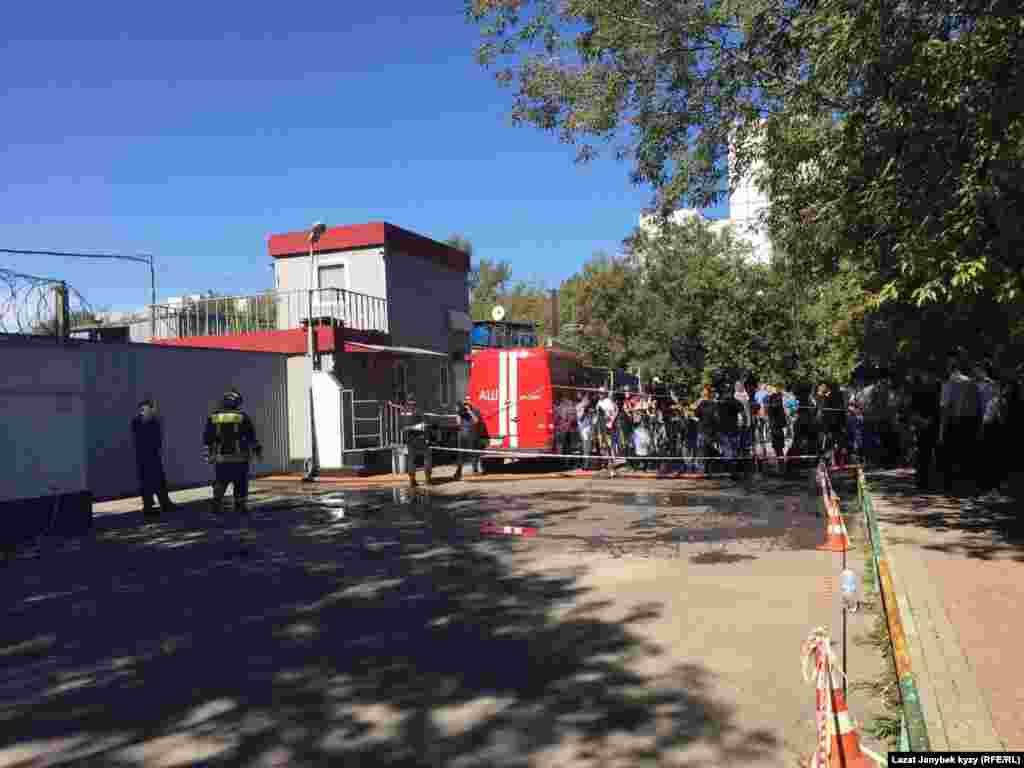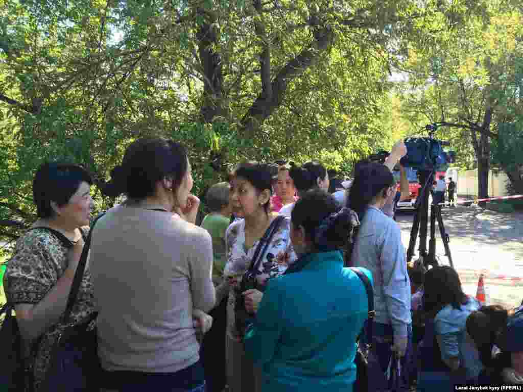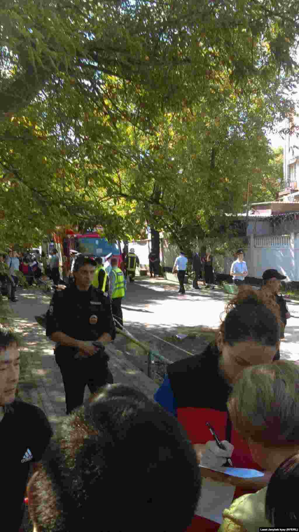 Өрт кырсыгы орун алган имараттын алдында турган кыргызстандыктар.