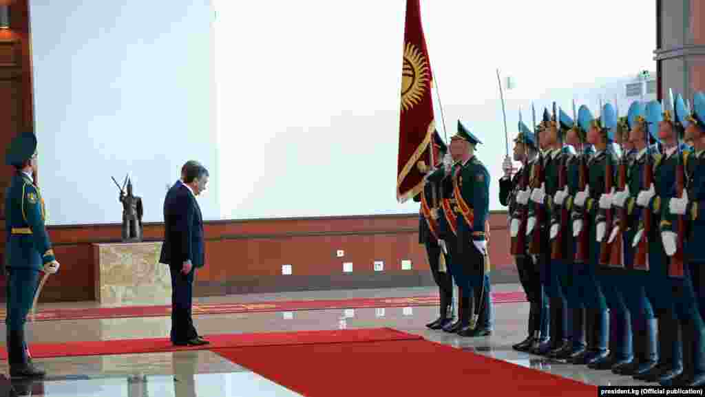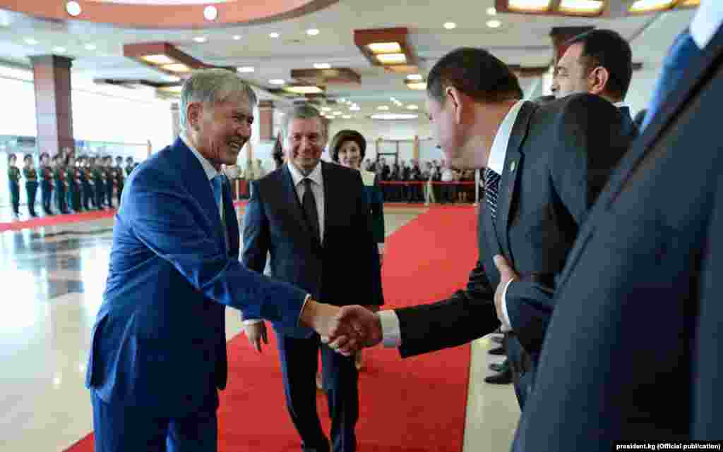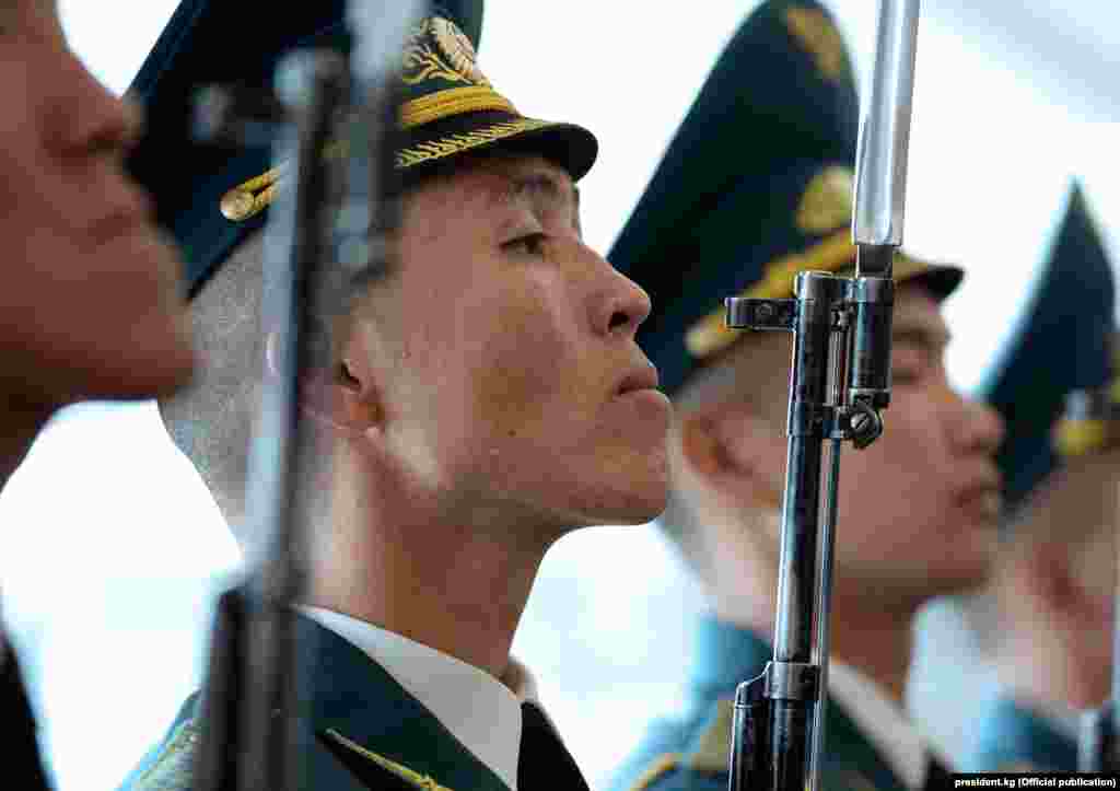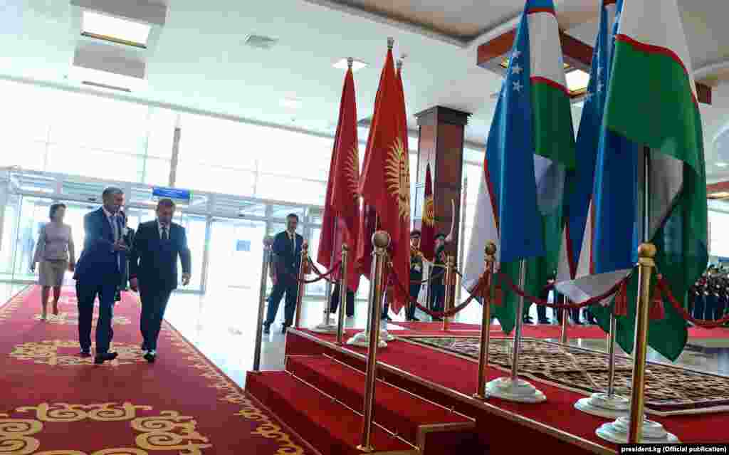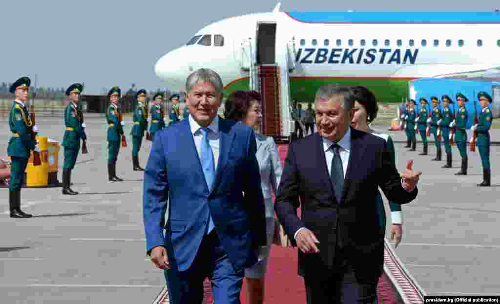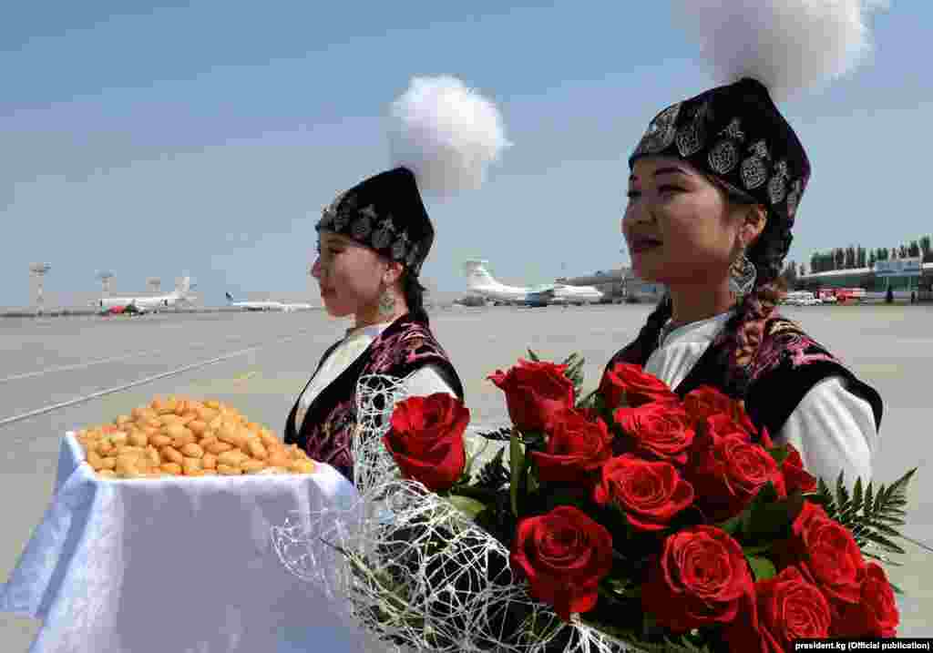 "Манас" аба майданынан Улуттук гвардиянын ардак кароолунун коштоосунда өзбек президенти жана анын жубайы Зироатхан Мирзиёеваны кыргыз лидери жубайы Раиса Атамбаева менен бирге тосуп алышты.